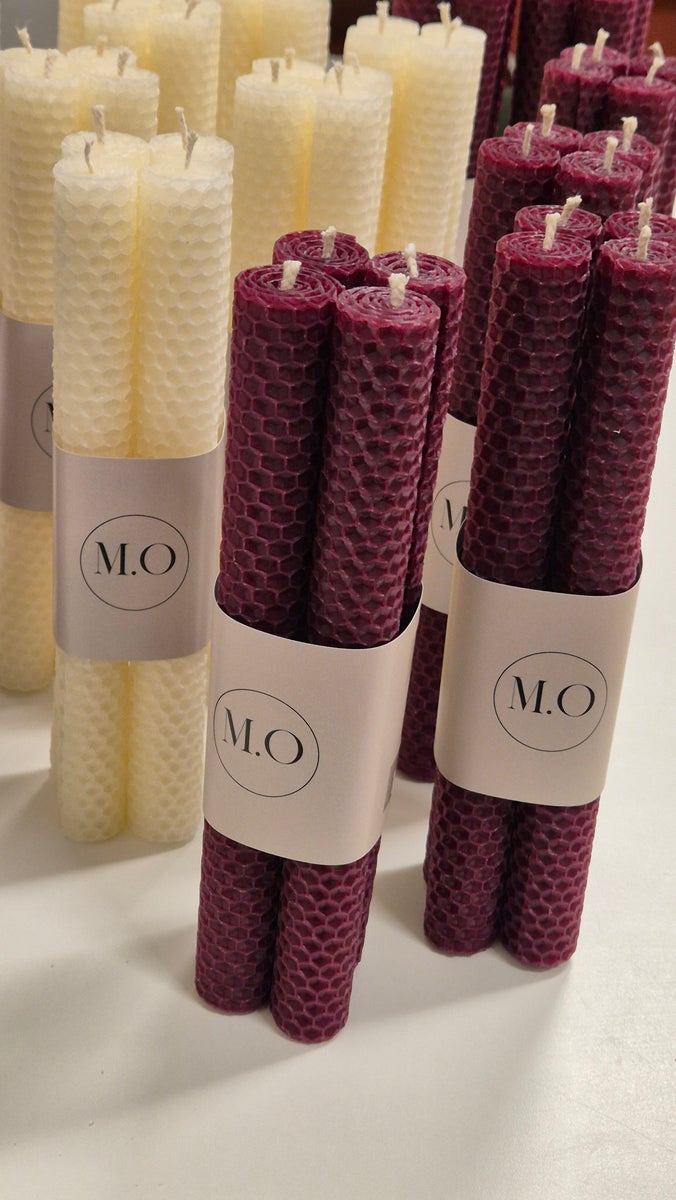 Mehiläisvahasta käsin valmistettuja kruunukynttilöitä 4kpl, väri viini. Paloaika on noin 5,5 h.